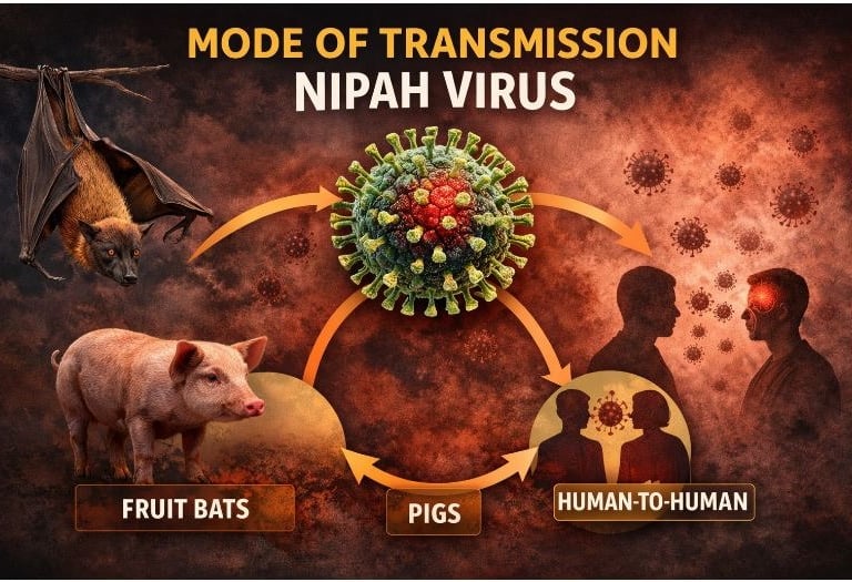As Nipah virus is a zoonotic disease, its primary source of transmission is bats. When healthy humans get exposed to the fluids and secretions like saliva, urine or even faeces of bats, infection is observed.